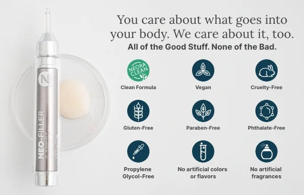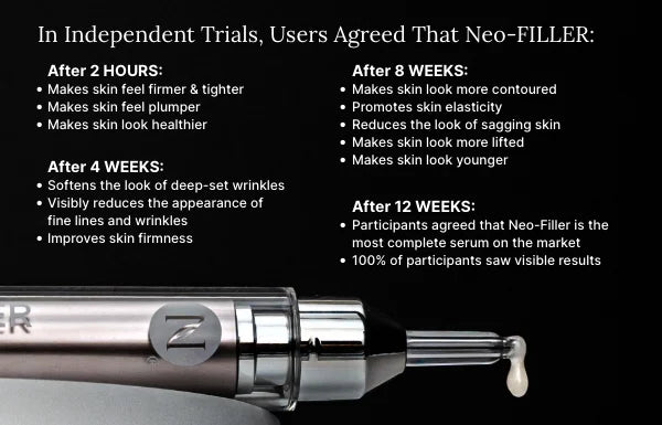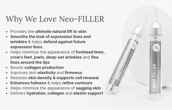 How does Neo-FILLER work so fast and effectively? We combined three unique innovations into a one-of-a-kind product, that includes a cutting-edge blend of growth factor peptides and plant stem cells, natural bioactives, and a natural biostimulator to target forehead lines, crow's feet, under-eye bags, jowls, frown lines and more. Firmer, more sculpted looking skin awaits, naturally.